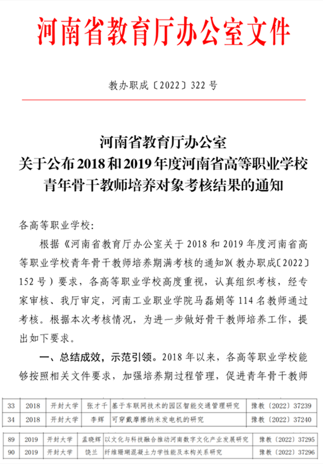 本站讯 近日,河南省教育厅公布了2018和2019年度河南省高等职业学校青年骨干教师培养对象考核结果,我校张才千、李辉、孟晓辉和饶兰4名教师顺利通过考核,并将颁发“河南省高等职业学校青年骨干教师”证书。