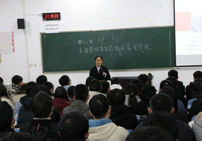 刘青老师以《全民国家安全教育日宣传片》为引言,讲授了《全面贯彻落实总体国家安全观》专题内容,带领学生学习了“为什么说保证国家安全是头等大事”“什么是总体国家安全观”“怎样着力防范化解重大风险”三部分内容。整堂课程氛围活跃,师生互动频繁,学生们听课认真,回答问题积极。