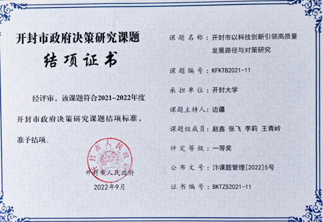 本站讯 近日,从开封市政府发展研究中心获悉,我校实验实训与工程训练中心主任边疆老师承担的课题《开封市以科技创新引领高质量发展路径与对策研究》被开封市委市政府智库联盟《智库要报》第41期刊发。