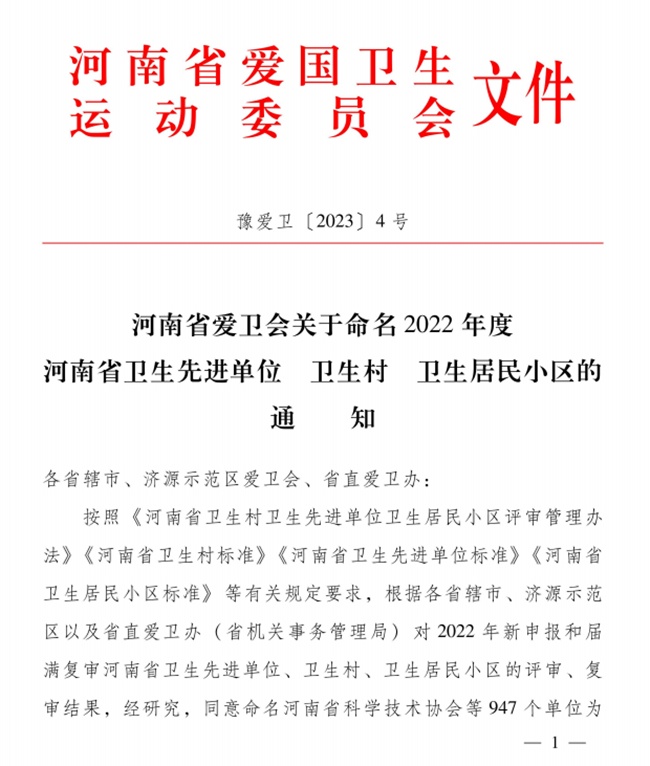 本站讯 近日,我校被河南省爱国卫生运动委员会授予“2022年度省级卫生先进单位”荣誉称号。