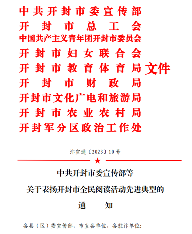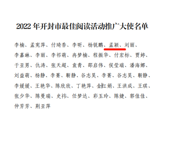 本站讯 近日,由中共开封市委宣传部等9个部门联合下发的《关于表扬开封市全民阅读活动先进典型的通知》中获悉,我校被评为“2022年开封市书香校园”,我校图书馆报送的《书海茫茫“盲”悦读》活动被授予“2022年开封市最佳阅读活动项目”,图书馆孟颖老师被授予“2022年开封市最佳阅读活动推广大使”称号。