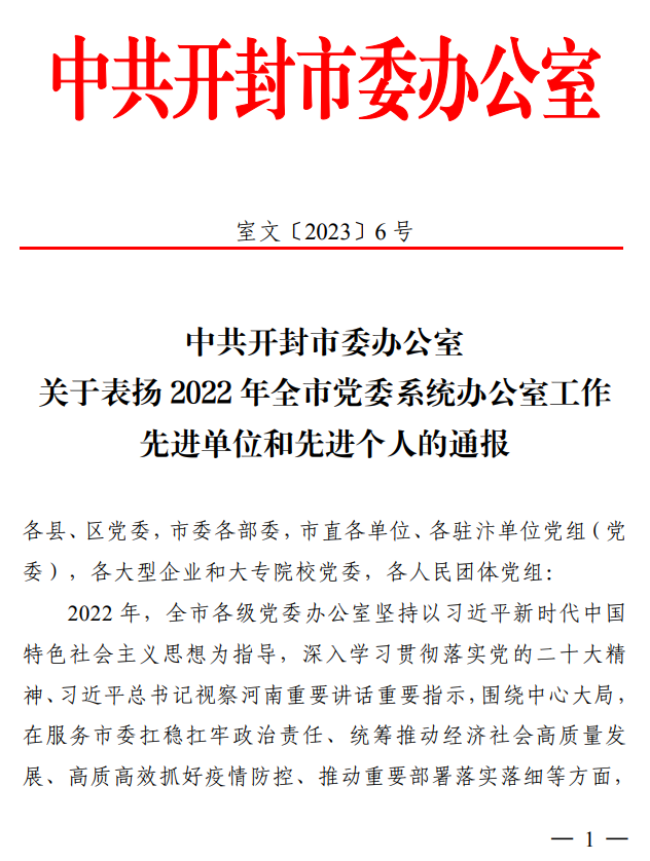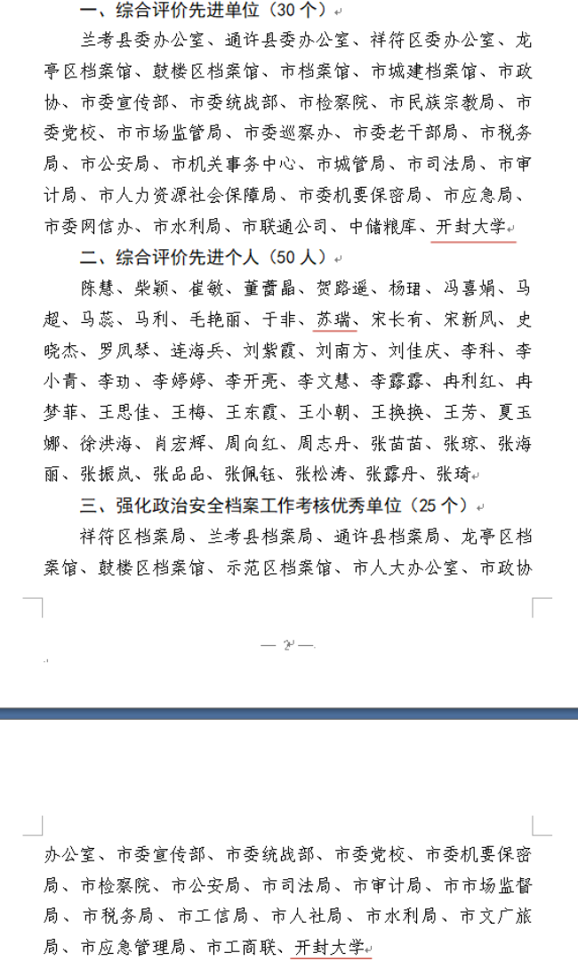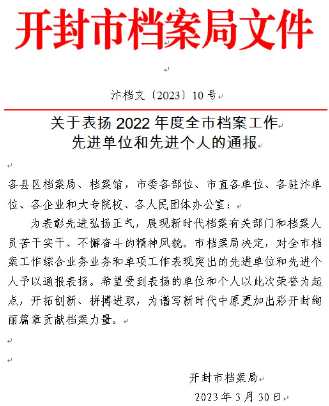本站讯 近日,从汴档文【2023】10号《关于表扬2022年度全市档案工作先进单位和先进个人的通报》、室文【2023】6号中共开封市委办公室《关于表扬2022年全市党委系统办公室工作先进单位和先进个人的通报》获悉,我校喜获2022年度“全市档案工作综合评价先进单位”“强化政治安全档案工作考核优秀单位”。同时,徐莹、苏瑞老师分别获得“档案工作先进个人”和“综合评价先进个人”荣誉称号。