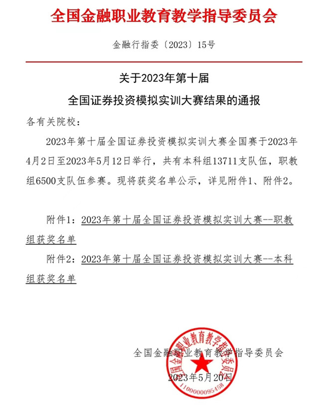 本站讯 近日,由全国金融职业教育教学指导委员会组织的2023年第十届全国证券投资模拟实训大赛顺利结束。本次大赛共有本科组296所院校的13711支队伍参赛,职教组226所院校的6500支队伍参赛。大赛以线上投资模拟(股票、基金、债券)方式进行,各参赛队伍线上模拟投资,按照总账户收益率排名。