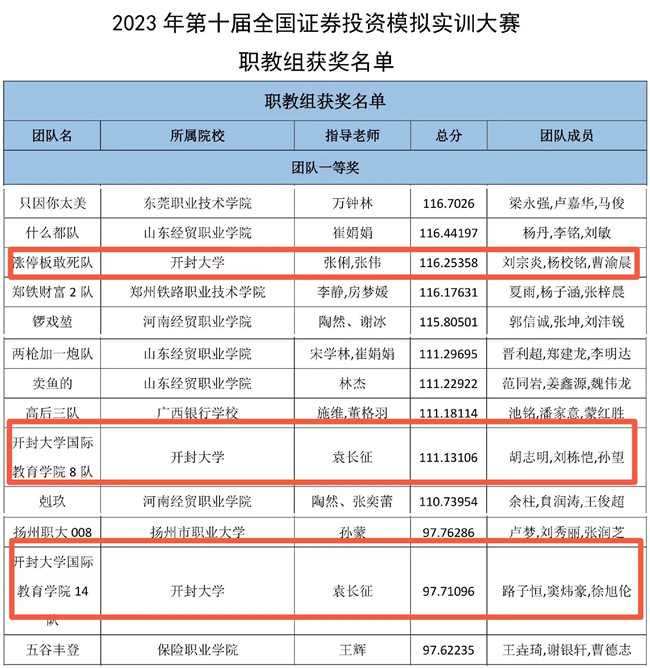 经过40天的激烈角逐,我校财政经济学院张俐老师指导的财富管理、金融科技应用专业学生刘宗炎,杨校铭,曹渝晨组成的参赛队获一等奖1项;国际教育学院袁长征指导的国际金融专业学生胡志明,刘栋恺,孙望组,路子恒,窦炜豪,徐旭伦组成的两支参赛队获一等奖2项。其中2支队伍以职教组北部赛区第4和第8名的佳绩进入今年6月在上海举办的全国冠军邀请赛。张俐和袁长征两位老师获得“优秀指导教师”奖。