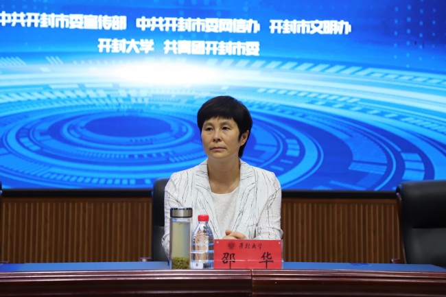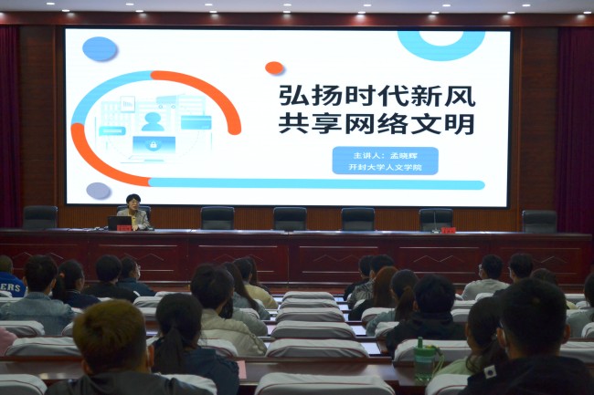 在行政楼第一会议厅,我校网络素养教育实践基地教师孟晓辉向开封市各高校师生代表开展了题为《弘扬时代新风 共享网络文明》的网络素养教育专题讲座。市委网信办工作人员在讲座现场与学生进行了网络文明小知识互动答题。