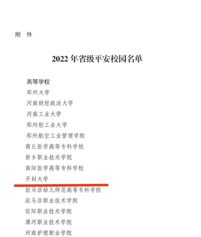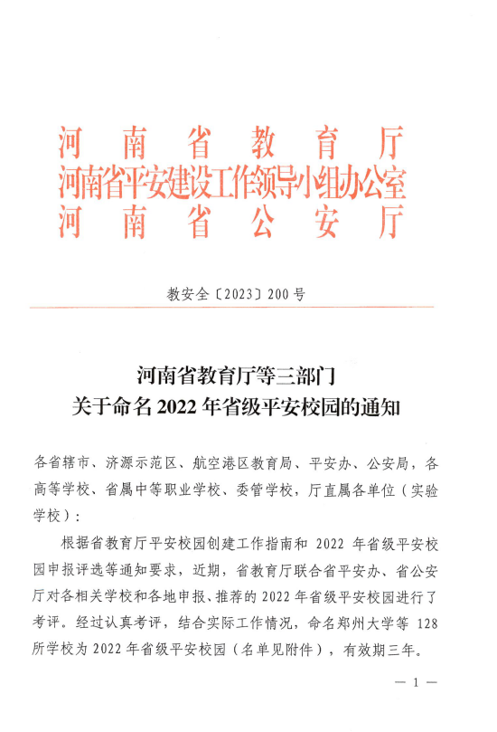 本站讯 近日,河南省教育厅、河南省平安建设工作领导小组办公室、河南省公安厅联合下发《关于命名2022年省级平安校园的通知》(教安全﹝2023﹞200号)文件,我校被命名为“省级平安校园”,这是我校继2015年以来第三次获评该荣誉,有效期三年。