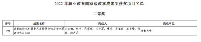 本站讯 近日,《教育部关于批准2022年国家级教学成果奖获奖项目的决定》(教师〔2023〕4号)文件公布,我校作为独立完成单位由宋志敏教授主持申报的《高职院校本科教育人才培养定位及专本贯通研究与实践》获职业教育国家级教学成果奖二等奖。这是我校首次获评国家级教学成果奖,实现了国家级教学成果奖的历史性突破。