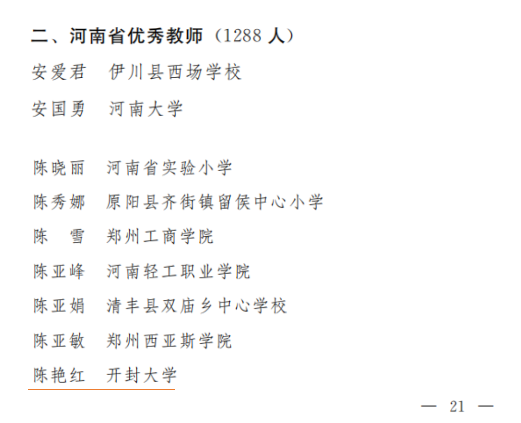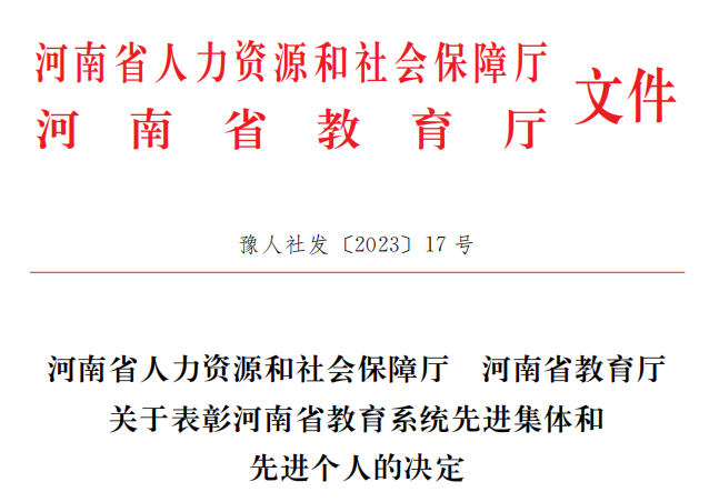 本站讯 近日,2023年河南省教育系统先进集体和先进个人评选表彰结果揭晓,我校党委副书记储建新获评河南省优秀教育工作者,陈艳红获评河南省优秀教师。