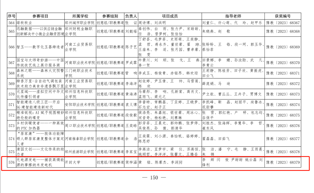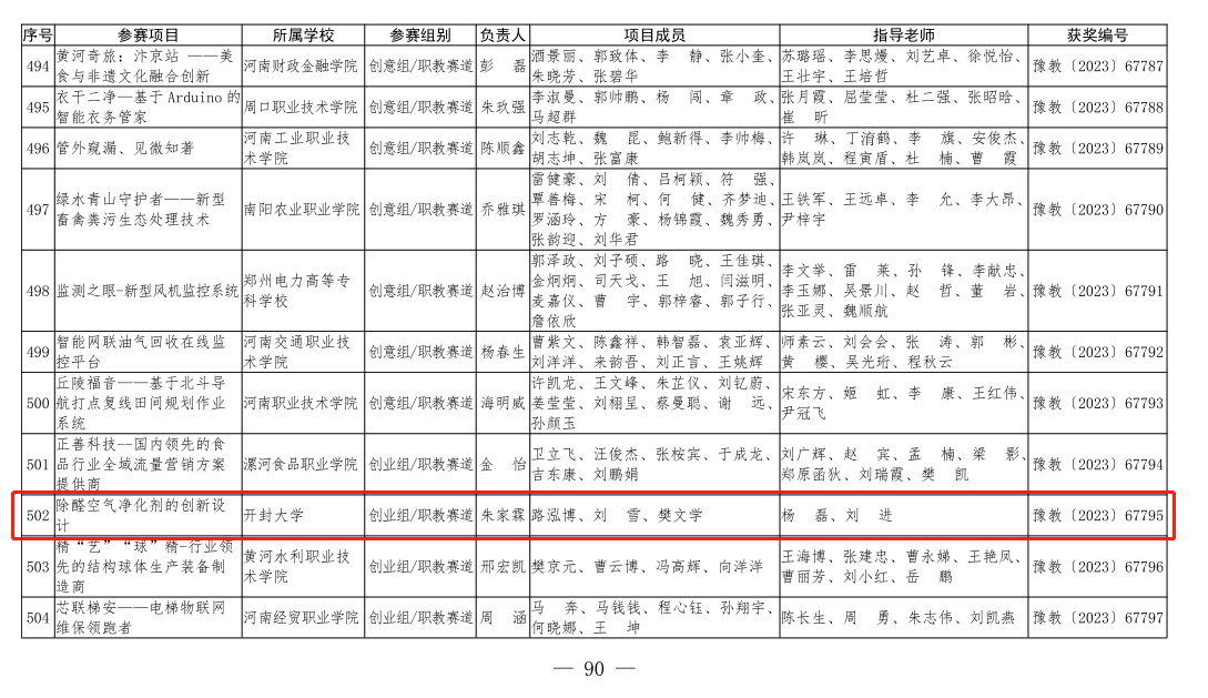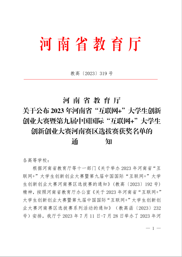 本站讯 近日,河南省教育厅公布了2023年河南省“互联网+”大学生创新创业大赛暨第九届中国国际“互联网+”大学生创新创业大赛河南赛区选拔赛获奖名单,我校荣获省级二等奖1项、三等奖1项。其中二等奖项目《除醛空气净化剂的创新设计》入围全国总决赛,实现了我校在“双创”类比赛中的重大突破。