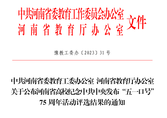 本站讯 近日,中共河南省委教育工委办公室、河南省教育厅办公室发布了《关于公布河南省高校纪念中共中央发布“五一口号”75周年活动评选结果的通知》,我校取得一等奖1项,二等奖1项的优异成绩。