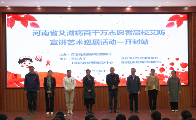 本站讯 为加强大学生群体的防艾意识,推进艾滋病防治工作,持续发挥好志愿者的主力军作用,11月16日,河南省艾滋病百千万志愿者高校艾防宣讲艺术巡展活动在我校举行。河南省疾控中心性病艾滋病防治研究所副所长李宁、开封市疾控中心党委副书记梁建立、校党委副书记储建新出席活动,我校师生代表400余人参加此次活动。