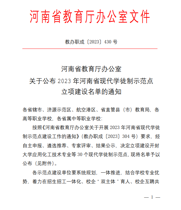 本站讯 近日,河南省教育厅发布了《关于公布2023年河南省现代学徒制示范点立项建设名单的通知》,材料与化学工程学院的应用化工技术专业被确立为河南省现代学徒制示范点。