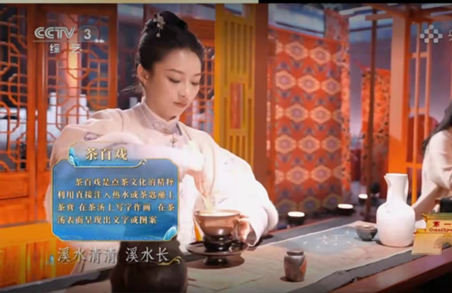 《新春非遗之夜》节目将文化传承与歌舞盛会并举,观众可以观非遗、学非遗,寓学于乐。由著名演员王雷演唱的《说茶》歌曲中,介绍了茶叶的发展历史、六大茶类的代表性名茶、制茶工艺以及冲泡方法。来自全国各地的茶艺非遗传承人们生动地向观众展示了不同茶类的品饮方式。旅游学院2022级酒店管理与数字化运营专业的学生孙梦璐和王东大师团队成员张丽英老师在节目中向观众展示了宋代七汤点茶技艺。从调膏到注汤击拂,孙梦璐动作行云流水,茶盏中乳勃鲜白绵密,轻云渐生,完美呈现了宋代点茶。孙梦璐同学还参加了由央视著名主持人孙晓梅主持的《非遗里的中国年》座谈节目的拍摄,将在春节期间CCTV1、CCTV3陆续播出。