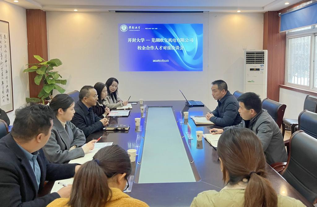 本站讯 3月12日,我校与芜湖欧宝机电有限公司在行政楼第一会议室召开校企合作人才对接洽谈会。芜湖欧宝机电有限公司总经理许继群、部长周冰,副校长李治出席会议,就业与与校企合作处、机械与汽车工程学院、电子电气工程学院相关人员参会。