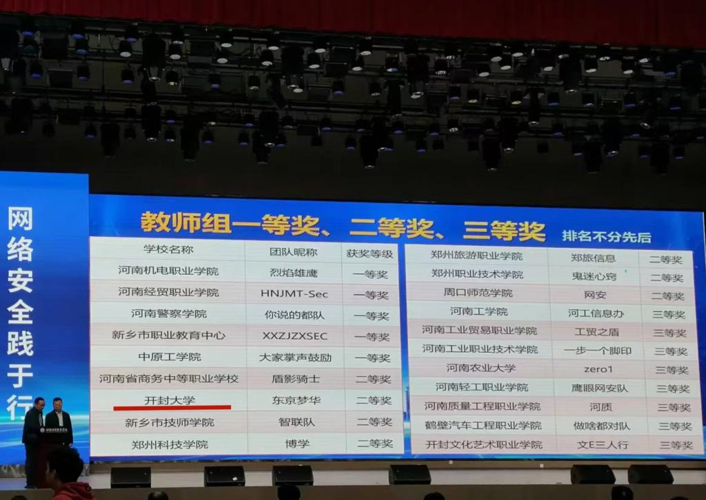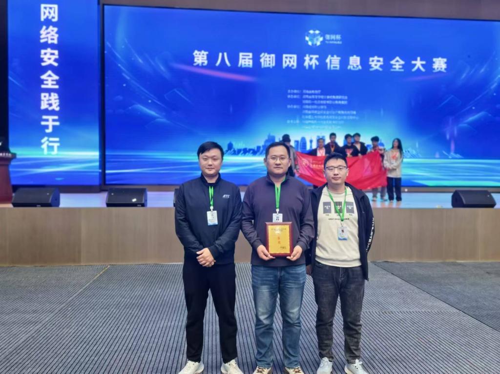本站讯 10月25日-27日,河南省第八届御网杯信息安全大赛在河南经贸职业学院举行。我校信息工程学院老师付红杰、陈玉林、孙乐婵组成的团队荣获教师组二等奖。