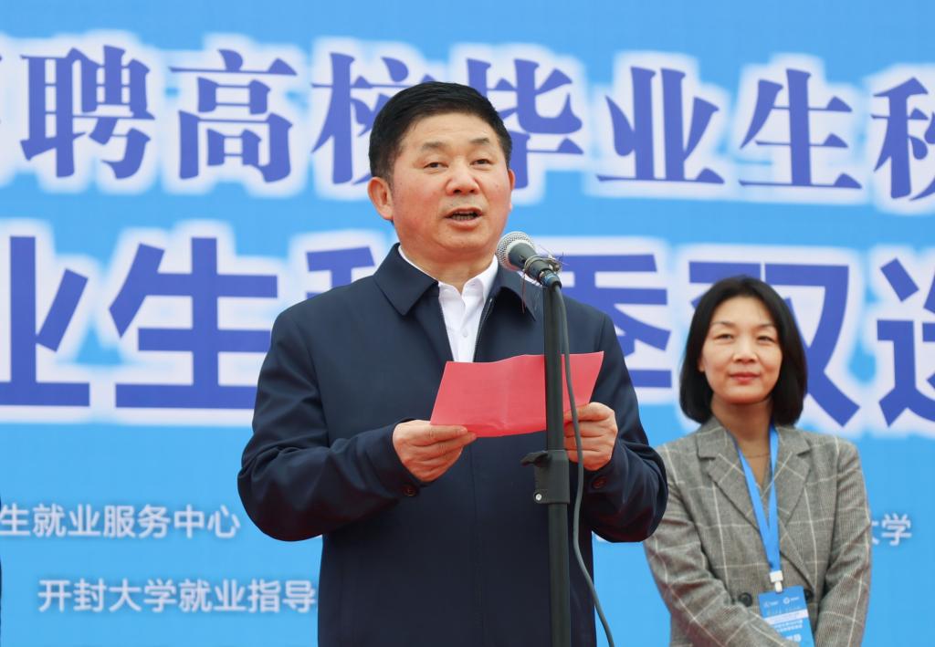 校长王德如、副校长万是明,开封市人力资源和社会保障局党组成员、副局长魏蕾,宁波市鄞州区人力资源和社会保障局人才服务中心主任宋磊杰、河南大学就业指导服务中心副主任栗晓文、河南开封科技传媒学院招生就业处处长惠鑫、开封文化艺术职业学院招生就业处处长王飞、商丘应用科技学院招生就业处处长徐婷婷、开封职业学院招生就业处处长王轩轶、思念集团人力资源经理蔡堂兵出席启动仪式。启动仪式由副校长李治主持。