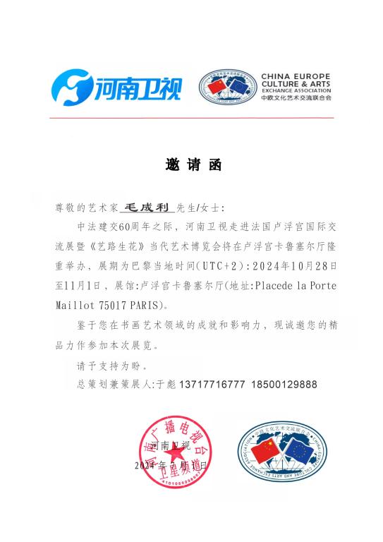 为庆祝中法建交60周年,河南卫视在巴黎卢浮宫举办了“艺路生花”当代艺术博览会国际交流展。来自中国的400多位艺术家参展,展示丰富的东方文化艺术。其中,bat365在线官方网站教师毛成利受邀参展书法作品,助力中法文化交流。