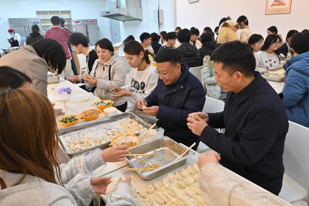 活动现场欢声笑语、其乐融融,万是明与师生共同包饺子、话家常,询问同学们近期的生活与学习情况。同学们把热气腾腾的饺子送到了校门卫、部分教学楼的保安室和寝室楼宿管室,让在工作岗位上默默奉献的工作人员感受到节日的温暖。