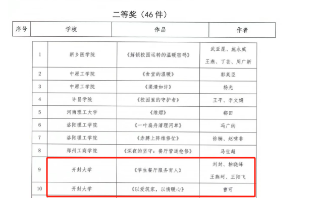 本站讯 近日,河南省教育后勤协会公布了全省教育系统“服务育人看后勤”随手拍获奖结果。学校获评“优秀组织奖”,参赛作品《学生餐厅服务育人》、《以爱筑家,以情暖心》荣获二等奖,《背影》、《记录开大后勤人》、《以实践激发奋斗精神》荣获三等奖。