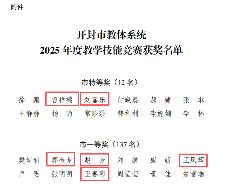 本站讯 近日,开封市总工会、开封市教育体育局联合印发《关于开封市教体系统2025年度教学技能竞赛获奖情况的通报》(汴总发〔2025〕28号)。我校在此次竞赛中表现优异,共选派9名教师参赛,经过激烈角逐,最终荣获市特等奖2项、市一等奖4项和市二等奖3项。