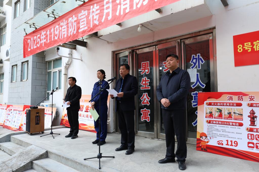本站讯 为贯彻落实河南省消防安全委员会《关于印发2025年河南省119消防宣传月活动方案的通知》精神,增强师生消防安全意识,提升消防安全事故防范与应急处置技能。11月13日下午,我校在7、8号宿舍楼前开展消防安全知识培训及疏散逃生演练。副校长院继恒参加活动并讲话。