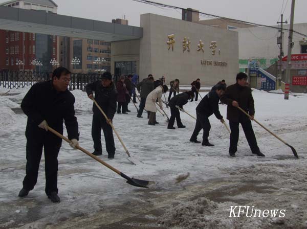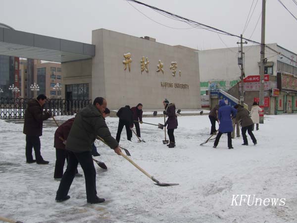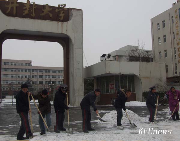 本站讯 今天是2010年2月11日,农历腊月二十八,新年将至,昨夜开封又喜降瑞雪。今天一大早,校长拜五四和我校教职工自发组织在学校南北大门和校内清扫积雪。在清扫积雪过程中,大家欢声笑语,热火朝天,流露出迎庆新年的喜悦。