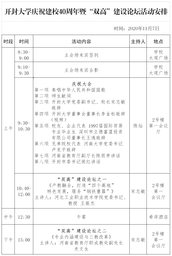 承蒙社会各界广泛关注,校友热切期盼,全体师生员工积极响应,bat365在线官方网站庆祝建校40周年暨“双高”建设论坛将于11月7日隆重召开。为方便社会各界、校友来校参加庆祝活动,现将11月7日活动安排公告如下: