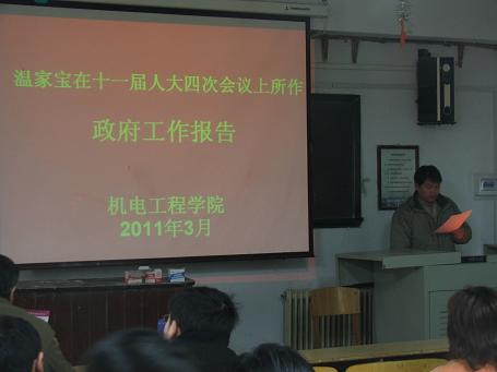 3月21日下午,按照学校统一安排,学院全体党员在1#216集中学习了温家宝总理在十一届人大四次会议上所作的政府工作报告,随后,共同观看了温总理2011年两会答中外记者问视屏录像。学习活动由学院党总支副书记鲁建明主持。