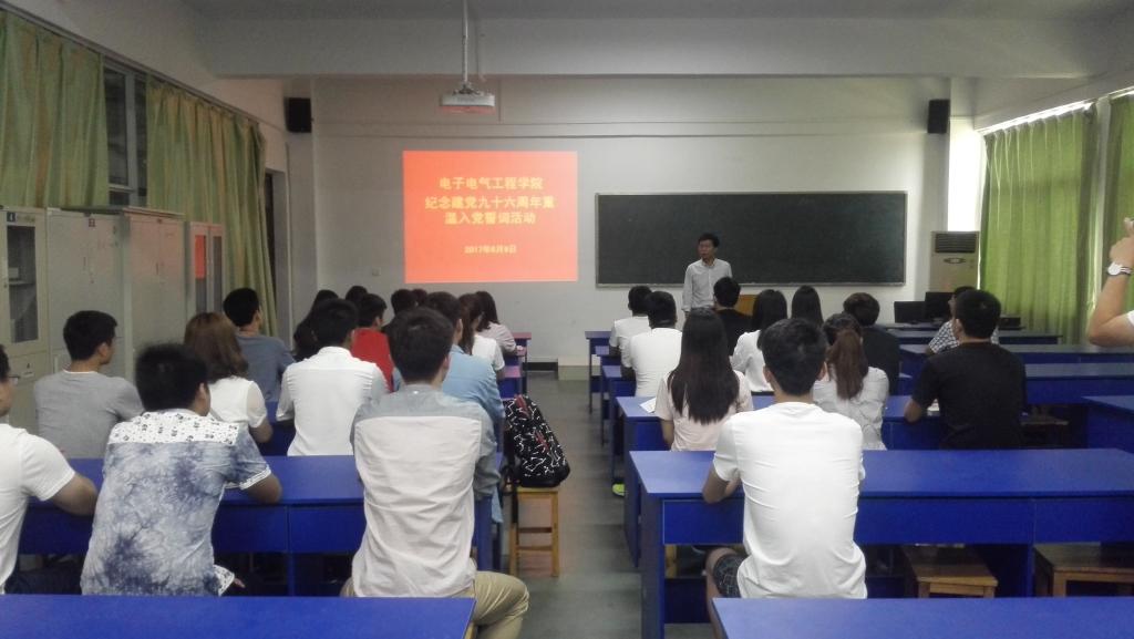 在中国共产党成立96周年之际,6月9日上午,电子电气工程学院学生党支部隆重举行老党员重温入党誓词曁新党员入党宣誓大会,学院党总支书记徐纪珂,副书记边疆,团总支书记王笑禹和学生支部全体老师出席了此次活动,学院全体学生党员参加了宣誓,大会由团总支书记王笑禹主持。