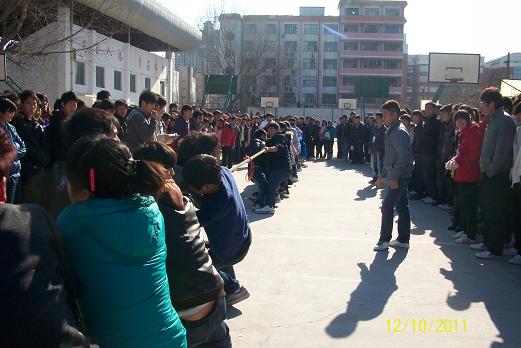 大赛以班级为单位,各班选出12名男生与3名女生组成一队参加比赛,全院共有15个班级参加比赛。比赛共分三个阶段进行。第一轮为班级小组赛,获胜班级参加第二轮比赛,最后一轮为前三甲决赛。比赛顺序都由抽签方式进行。比赛过程中参赛的同学都竭尽全力“拼杀”,在这短暂的时刻各参赛队员都为了一个共同的目标进入了忘我的境界。欢呼声、呐喊声充满了整个操场。
