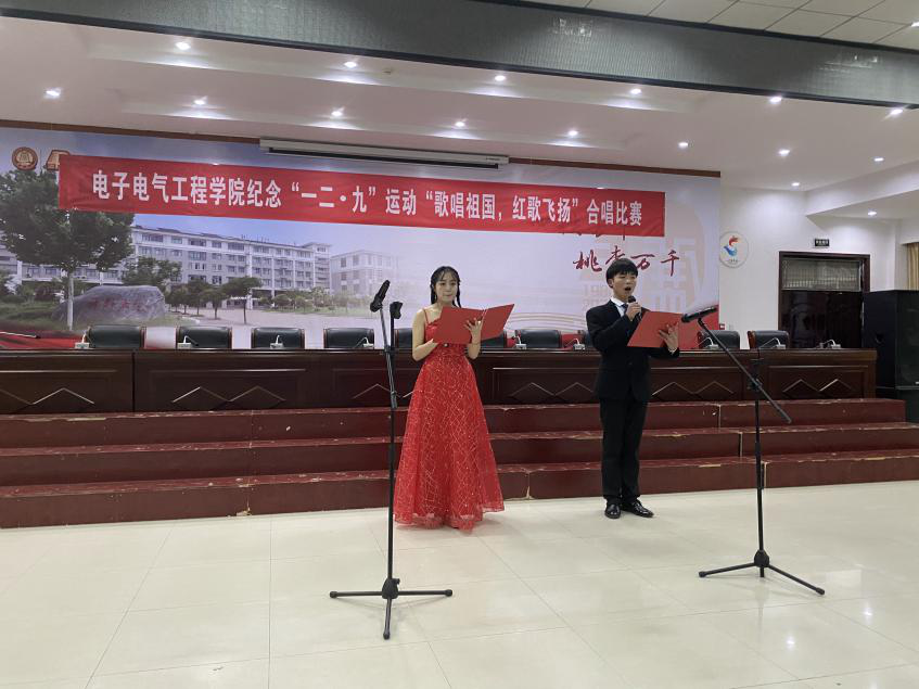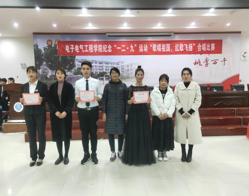 为进一步弘扬爱国主义的优秀传统,纪念“一二·九”抗日救亡运动85周年,电子电气工程学院于12月9日晚7点,在八号楼六楼举办了以“歌唱祖国,红歌飞扬”为主题的合唱比赛。院党总支书记张红艳、副书记杨辉、团总支负责老师李俊葳,以及各年级辅导员老师出席了本次比赛并担任评委。