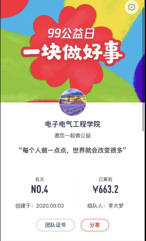 活动中,我院全体党员干部、教职工在党总支书记张红艳带头下积极参与,充分利用微信、工作群、朋友圈等各种媒介、平台踊跃捐款,并号召和带动我院各年级学生积极参与,通过分享二维码、组队募捐等方式为本次“99公益日”“河南助力春蕾计划”项目进行捐款,营造了关心帮助困难群体的浓厚氛围。