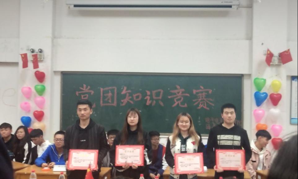 比赛开始之前,全体师生合唱共青团团歌。参赛成员分为四组,每组三人,分别是18电气一班、18电气二班、18物联一班和18电子班。比赛分为个人必答题、小组必答题、限时题和简答题四个环节。比赛中,选手们都精神饱满,认真作答,均以接近满分的成绩通过了第一轮的个人必答题。在第二轮和第三轮的小组必答题及抢答题中,各小组不甘示弱,分秒必争。经过了两个小时的激烈角逐,各个奖项尘埃落定,比赛共决出一等奖,二等奖,三等奖,优秀奖。一等奖由电子班夺得。