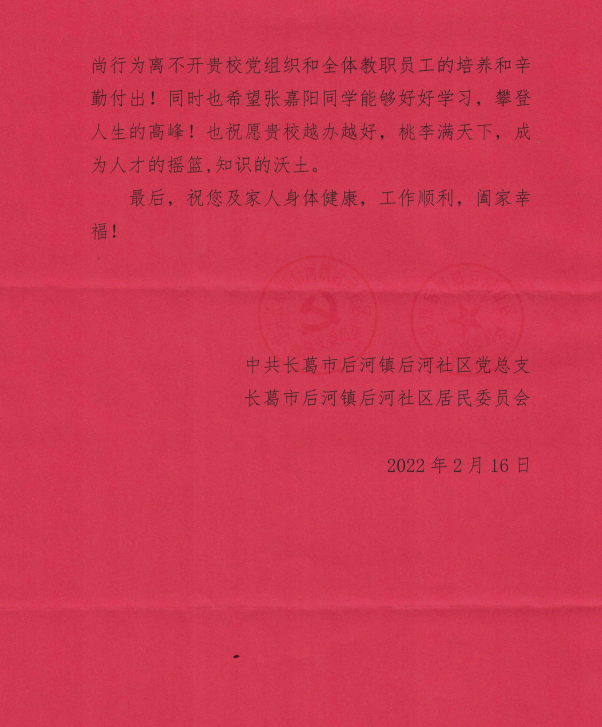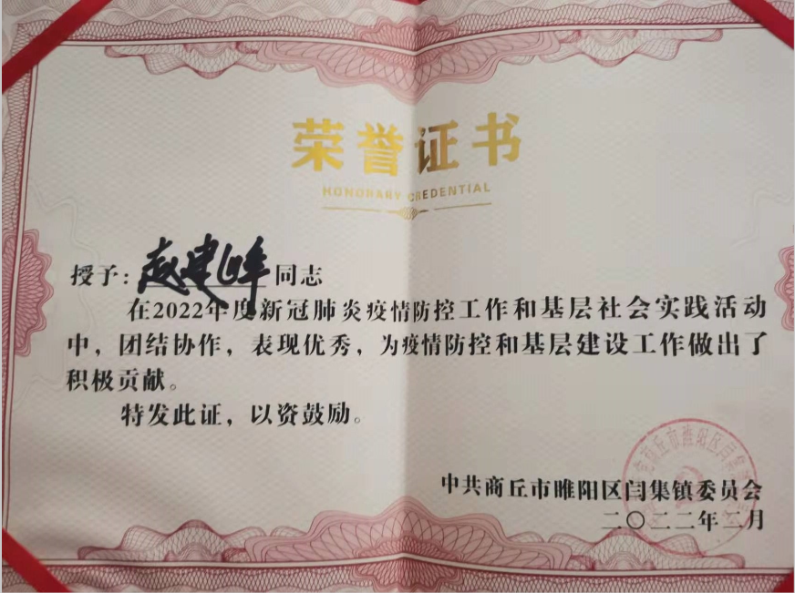 学院先后收到来自中共大马乡委员会、中共商丘市睢阳区闫集镇委员会、中共长葛市后河镇后河社区党总支的三封感谢信,分别对2021级赵建峰、2020级张亚楠、2019级张嘉阳等3名学生参加家乡疫情防控工作和基层社会实践的突出表现给予了高度评价和赞扬,肯定了他们的舍己为人、无私担当、甘于奉献精神。