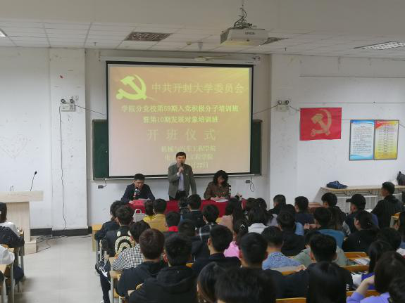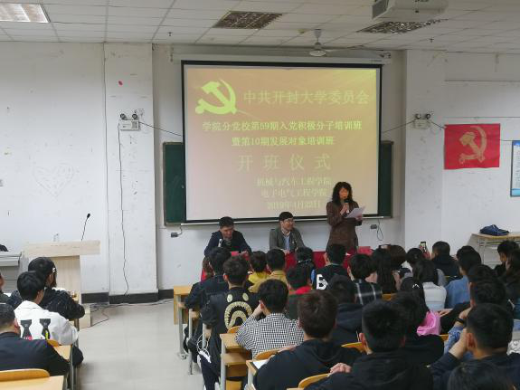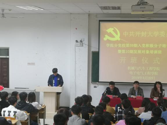4月22日,机械与汽车工程学院与电子电气学院在17#楼116教室,联合举行第59期入党积极分子培训班暨第10期发展对象培训班开班典礼,机械与汽车工程学院党总支书记高润阔、党总支副书记闫金红、学生党支部书记王文慧和电子电气学院党总支书记张红艳、党总支副书记杨辉、全体辅导员老师以及本期144名培训班学员参加了开班典礼。开班仪式由机械与汽车工程学院党总支书记高润阔主持。