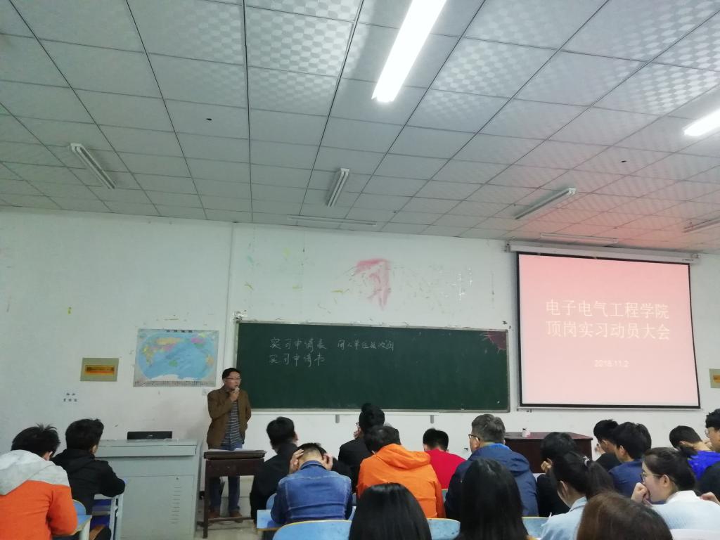 2018年11月2日13:30分,电子电气工程学院在15号楼135教室举办了毕业生顶岗实习动员大会,本次大会由大三辅导员朱朝旭老师主持,16级全体学生参加。学院党总支书记徐纪珂、党总支副书记边疆莅临本次大会。