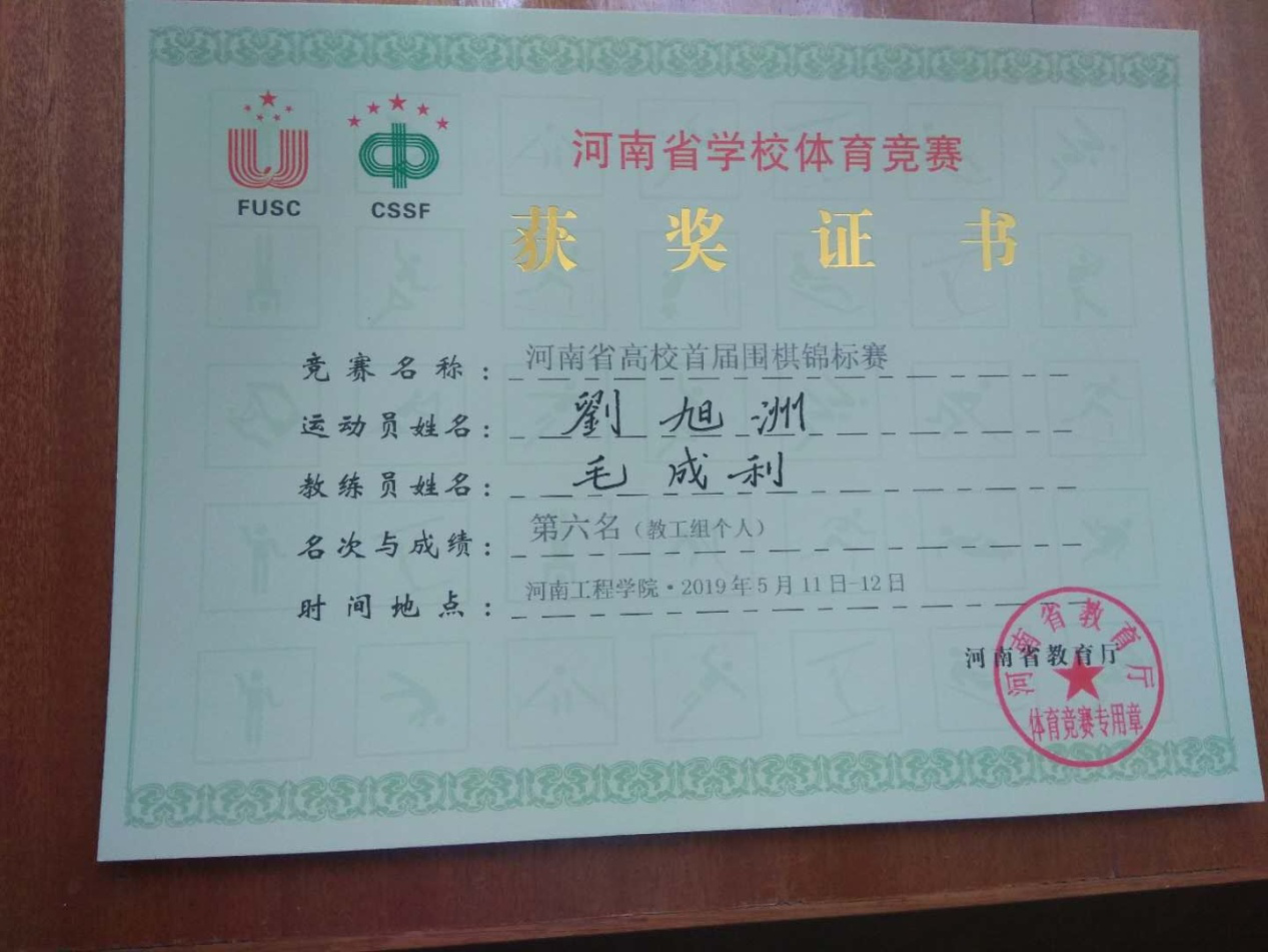 5月10日至12日,由河南省教育厅举办的2019首届河南省高校围棋锦标赛在河南省工程学院举行。我院刘旭洲老师作为bat365在线官方网站参赛队队员参加比赛。