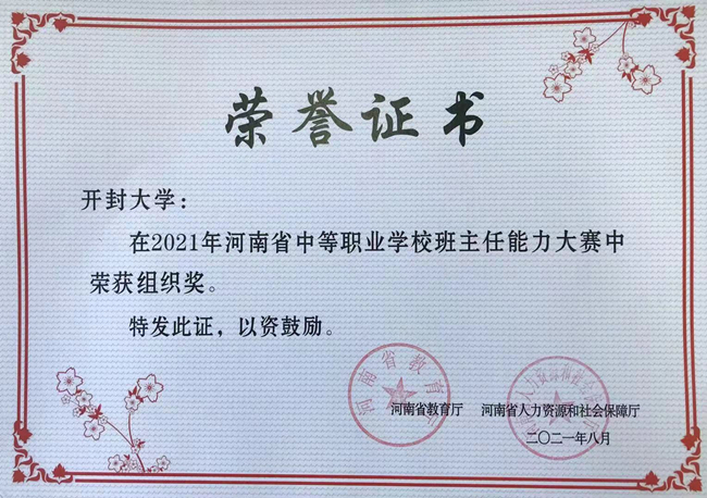 本站讯 近日,河南省教育厅、河南省人力资源和社会保障厅发布《关于公布2021年河南省中等职业学校班主任能力大赛获奖名单的通知》(教职成〔2021〕292号),我校荣获2021年河南省中等职业学校班主任能力大赛“组织奖”。