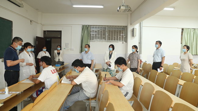 演练内容主要包括快速启用隔离考场、整场考生在疫情突发情况下的转移、考点迅速封控三大部分。教务处认真落实,制定详细的实施方案。演练针对一名考生出现了呼吸道疾病症状这一紧急情况,考场联络员老师马上报告我校考区主考,考区主考上报考点所在地的卫健委,疾控部门和医疗机构专业人员组成的防疫工作小组迅速进行个案研判,研判完毕之后,考生通过单独通道转移到备用隔离考场;随后考场监考员老师进行检查,并做好情况解释说明和考生情绪安抚工作,引导考场内其他考生继续完成考试,考试结束后,在卫健委、疾控部门指导下,对考生答卷等考试材料、考场、通道、桌椅等重点区域及物品进行必要的消杀。
