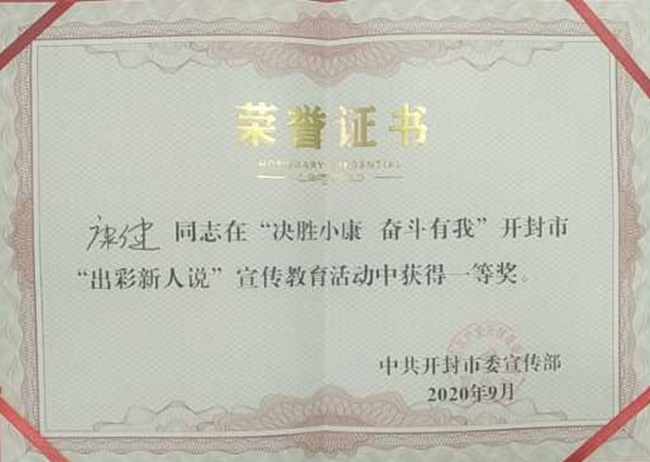 9月9日,由中共开封市委宣传部主办的“出彩新人说”宣传教育活动大赛在开封日报社新闻发布厅成功举行。我校推荐的人文学院康健老师在全市100多名参赛选手中脱颖而出,荣获一等奖。
