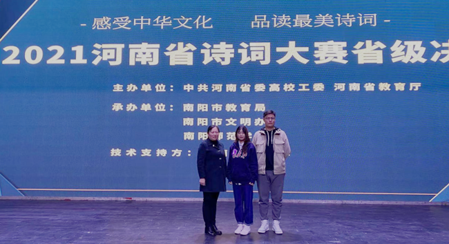 诗词歌赋绣口吟诵,华夏风韵千年不绝。10月20日,河南省诗词大赛省级决赛在南阳市拉开帷幕,来自全省各地600余名晋级选手齐聚南阳大剧院,共享诗词盛宴。我校由人文学院院长王茜、团总支负责人胡超带队参赛,2020级文化创意与策划1班学生董亚茹同学在比赛中荣获三等奖。