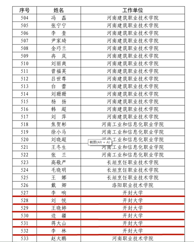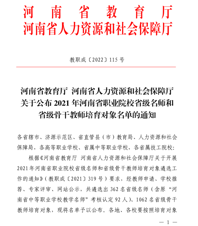 本站讯 近日,河南省教育厅、河南省人力资源和社会保障厅发布了《河南省教育厅河南省人力资源和社会保障厅关于公布2021年河南省职业院校省级名师和省级骨干教师培育对象名单的通知》(教职成〔2022〕115号)。我校李治、师兆忠、李军、赵书锋4位教师被评为2021年河南省职业院校省级名师培育对象,李响、刘悦、王晓婷、边疆、蒋大山、李林6名教师被评为2021年职业院校省级骨干教师培育对象。