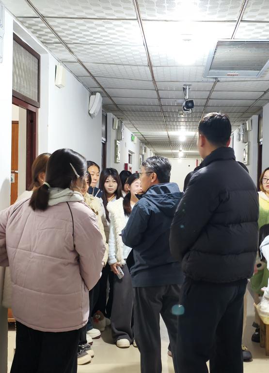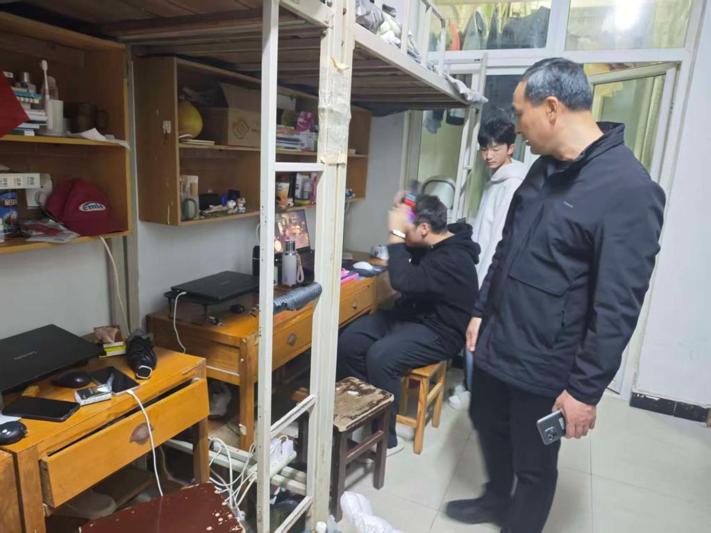 师生一行首先检查了宿舍卫生、物品摆放,结合当前甲流影响严重的情况,向同学们强调注意保持宿舍卫生和通风,养成良好的卫生习惯。同时重点排查了宿舍消防安全隐患、用电规范等情况,结合“互助共进”的全运理念,引导同学们要通力协作,凝心聚力搞好宿舍卫生和安全防范工作。对不足之处提出整改建议,鼓励大家在生活中要践行“全员参与、携手并进”的精神,入党积极分子要加强对口帮扶和监督。