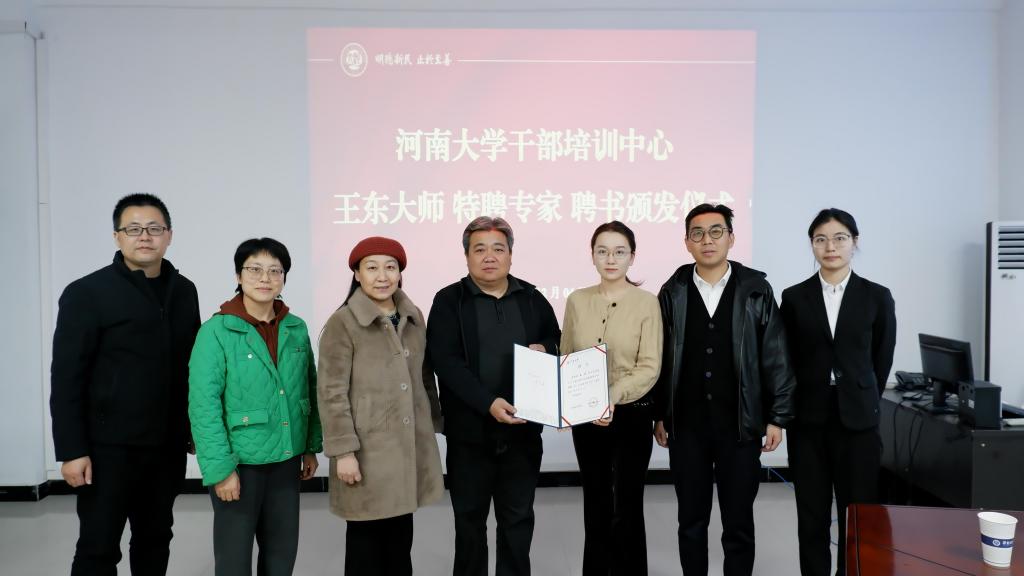 会上,文化与旅游学院院长赵瑾介绍了受聘专家王东的基本情况和在bat365在线官方网站期间的技术技能成就。河南大学干部培训中心教研部主任周玉婷为外聘专家颁发聘任证书。