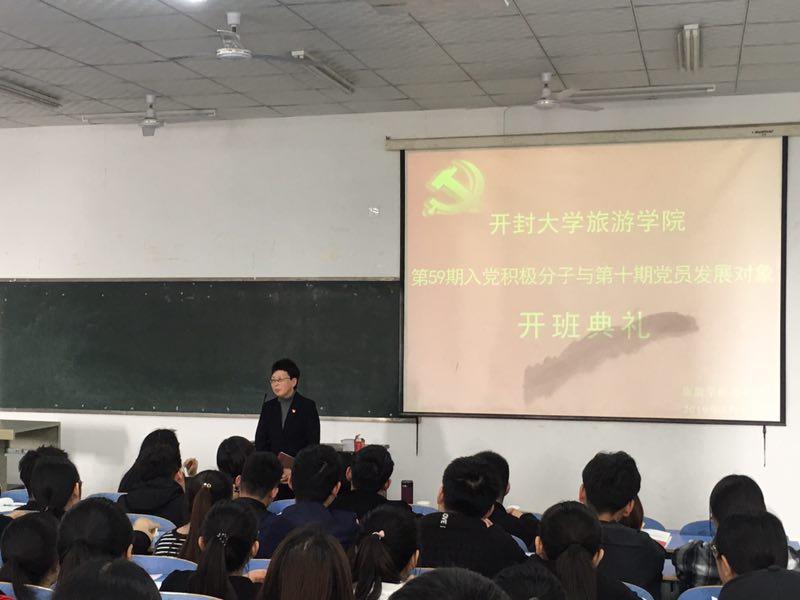 4月15日下午,旅游学院在15#435教室举行了分党校第59期入党积极分子培训班暨第10期党员发展对象培训班开班仪式。参加开班典礼的有bat365在线官方网站工会副主席秦雪峰、旅游学院党总支书记尤影及相关负责人,63名入党积极分子、22名党员发展对象参加了本次开班典礼。开班典礼由学院团学联组织部学生党员候闯主持。