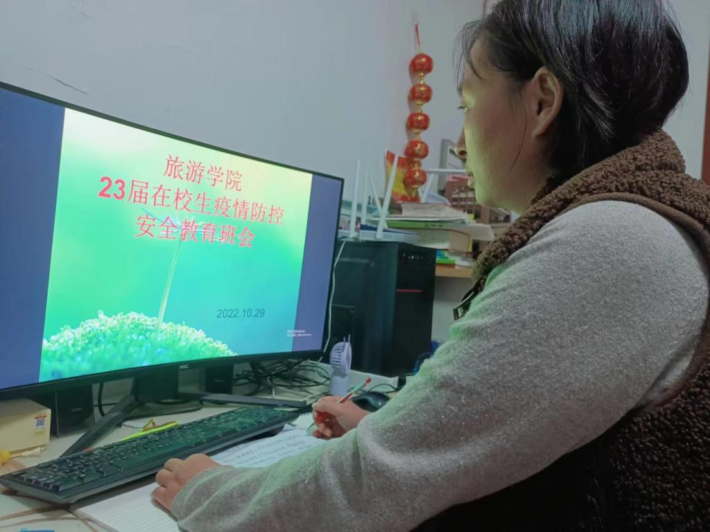 为进一步增强学生的疫情防控意识,引导学生深刻认识当前疫情防控的复杂性、艰巨性,更好地建立校园免疫屏障,筑牢学生安全防范、思想防线,引领学生树立抗疫必胜的信心和决心,激发学生爱国力行的责任担当,10月30日,旅游学院组织辅导员利用网络平台、采用线上会议形式,召开所有班级的线上疫情防控主题班会。