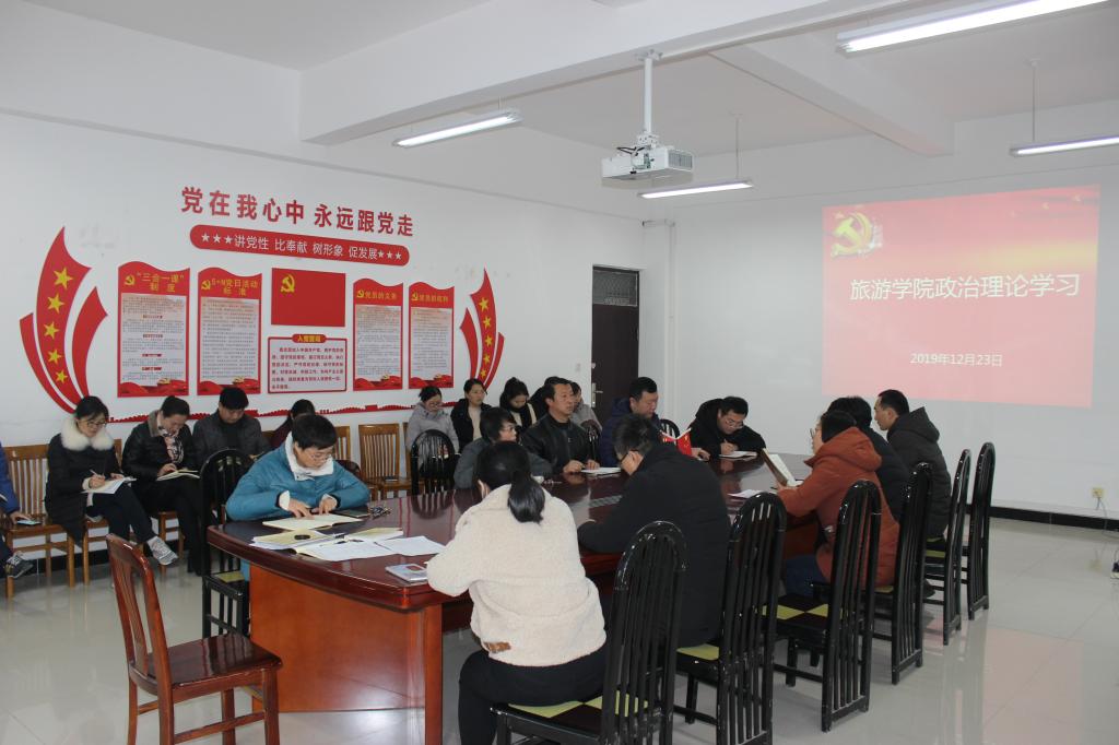 在会上首先由教工党支部书记王振鹏传达习近平总书记在全国经济工作会议上的重要讲话精神。12月10日至12日,中央经济工作会议在北京举行。习近平总书记在会上发表重要讲话,总结2019年经济工作,分析当前经济形势,部署2020年经济工作。会议重点学习了2020年我国经济领域六大重点工作,并结合专业,重点学习了要推动旅游业高质量发展。随后党总支书记尤影带领大家学习了中国共产党河南省第十届委员会第十次全体(扩大)会议精神,特别结合旅游管理专业,重点学习了会议中提到的推动文化繁荣等相关内容,会议要求要加快文化与旅游融合发展,围绕“中华源·黄河魂”,实施黄河文化旅游精品工程。尤影书记指出,要深刻领会会议精神,同时结合专业教学和科研情况,加强黄河文化旅游的相关研究。