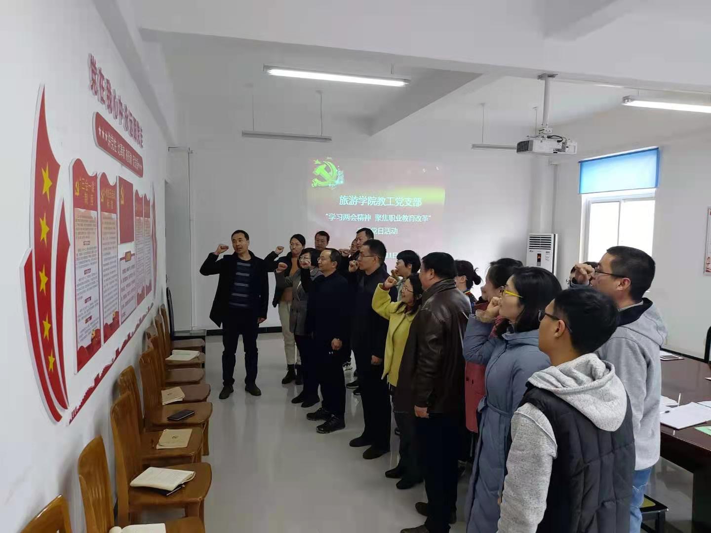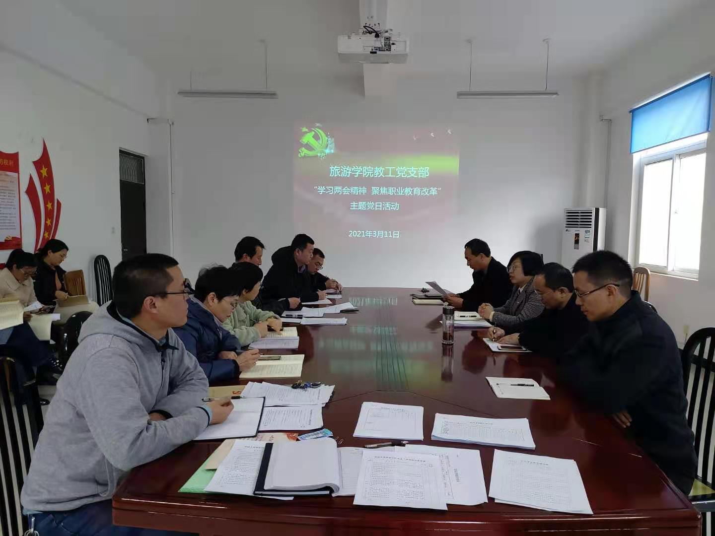 3月11日下午,旅游学院召开“学习两会精神,聚焦职业教育改革”主题党日活动,校党委委员、副校长李治及教工党支部全体党员参加。会议由教工党支部书记王振鹏主持。