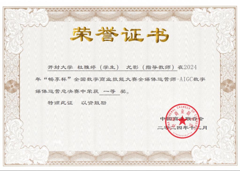 本站讯  12月28日,我校在2024年“畅享杯”全国数字商业技能大赛全媒体运营师-AIGC数字全媒体运营赛项中,分别荣获一等奖、二等奖各1项,在电子商务师-AIGC电子商务运营赛项中,分别荣获二等奖、三等奖各2项。