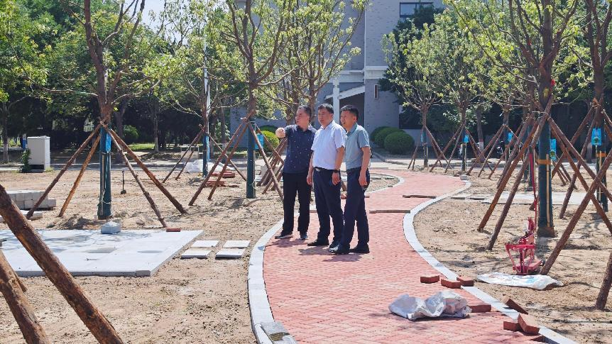 院继恒详细了解了植物品种选择、种植养护情况以及园路铺设等具体细节,对项目进展给予肯定并提出优化要求:一是做好绿化区域场地平整与土壤改良;二是对新铺设园路及时浇水沉降,确保稳固;三是加强新栽种树木和草坪的养护管理,提高成活率。他强调,绿化工作要着眼长远,注重生态效益与可持续发展。他要求项目团队在规划中选择适应性强、生长稳定的植物品种,确保形成健康稳定的校园生态系统,兼顾短期美化与长期生态效益。